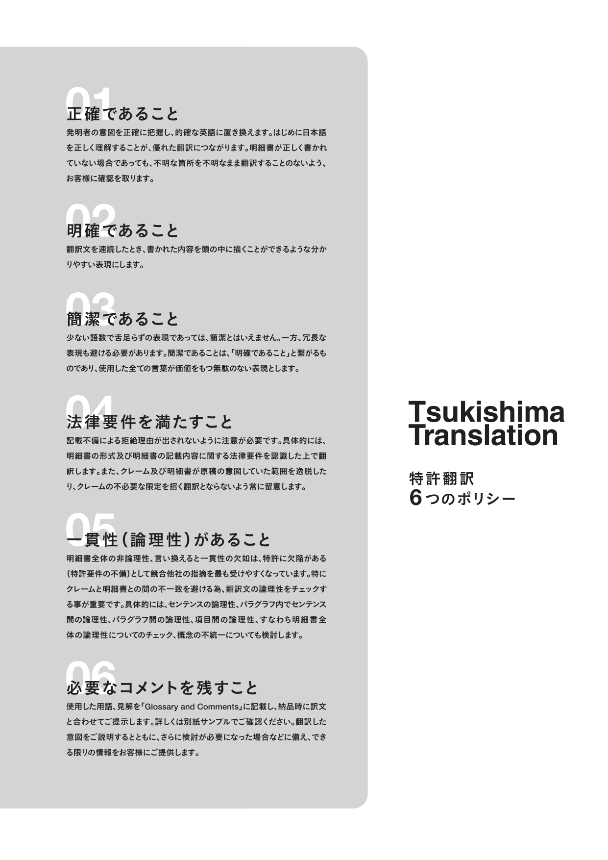 Tsukishima Translationは、6つのポリシーのもと、審査官や競合他社の厳しい目に耐え得る翻訳をお届けする為、案件毎のカスタマイズ(ご指定の書式・用語、類似案件・技術情報サイトの参照等)とお客様との開かれたコミュニケーションを大切にしています。